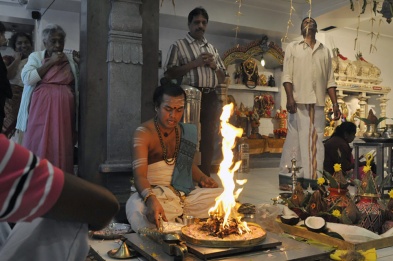 Cérémonie de homam (cérémonie du feu), première étape de la cérémonie en l’honneur de Ganesh.