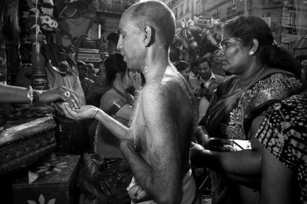 Le jour de la procession. Après deux semaines de prières et d’abstinence, les pénitents se préparent pour la procession. Ce pénitent porte un kavadi (arceau de bois) en hommage à Muruga, le frère de Ganesh.